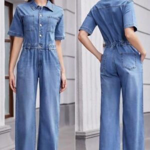 Short Sleeve Elastic Waist Denim Jumpsuit